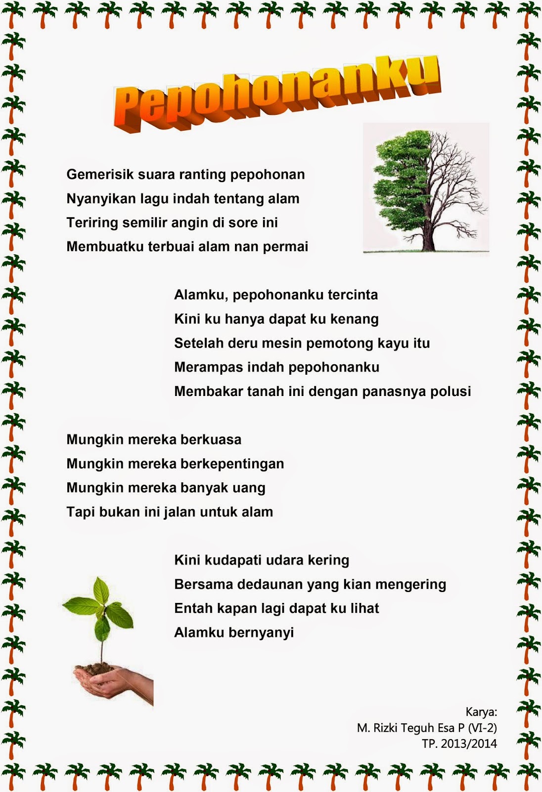 Puisi tentang bencana alam ini ditulis sebagai wujud keprihatinan atas banyaknya bencana yang terjadi di indonesia pada tahun 2009 lalu. Kekayaan alamnya di satu sisi telah menarik beberapa bangsa eropa hingga asia untuk menguasai ribuan kepulauan di negeri ini. 75 puisi alam tentang pegunungan hutan dan lautan. Di pagi itu, kulihat sekelilingku, awan putih seputih salju, langit cerah berwarna biru. Puisi tentang alam ialah puisi yang bercerita tentang berbagai fenomena di alam, seperti pegunungan, pedesaan, pantai, laut, atau tentang alam yang rusak.